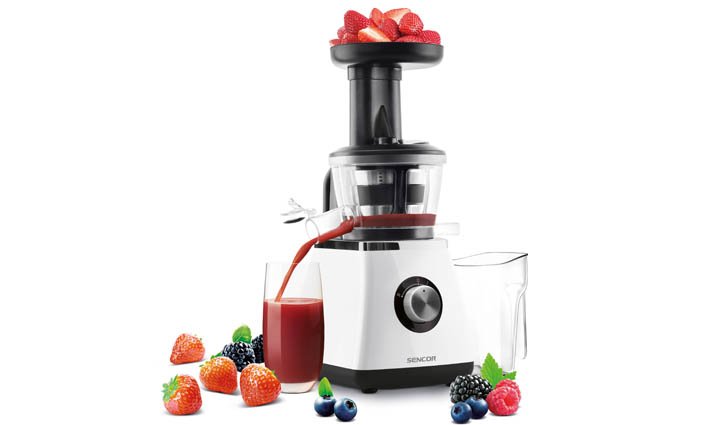 Šnekový odšťavňovač Sencor SSJ 4043WH v černo-bílé barvě.