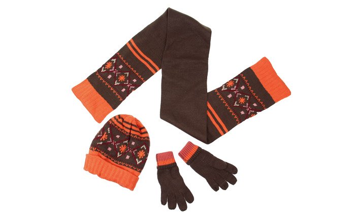 Zimní set šály, čepice a prstových rukavic v oranžové barvě.